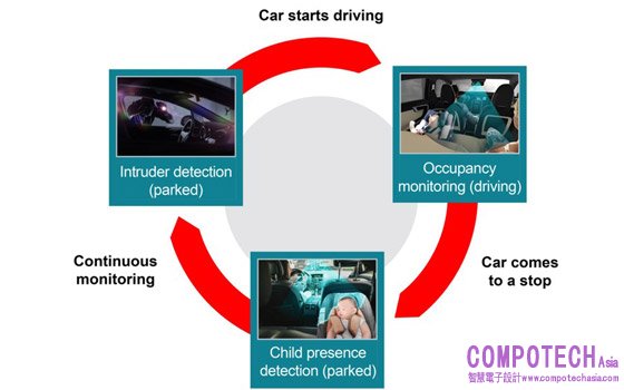為了因應最新設計趨勢和法規要求,OEM 正著重於三個主要的車艙內感測應用:用於安全帶提醒的占用監控、存在偵測 (特別是車內兒童偵測) 和入侵偵測。這些感測應用對於乘員在整個駕駛過程中的安全極為重要,如 图 1 所示。