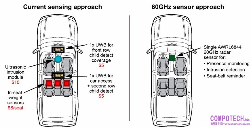 图 2. 目前車艙內感測設計方法與使用單一 AWRL6844 的簡化方法的比較