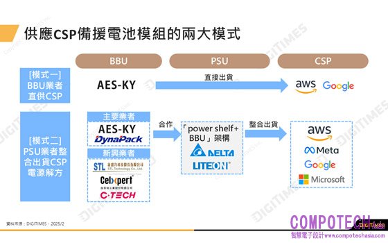 余佩儒觀察,目前台灣BBU業者出貨CSP發展出兩種供應模式,一是BBU業者直接出貨給美系CSP,目前僅AES-KY採用該模式;二是台達電與光寶兩大電源供應器業者,整合BBU,並採用「Power Shelf + BBU」架構供應CSP,為市場主流供應鏈模式。