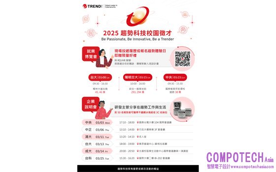 趨勢科技自3月起前進校園,首場企業說明會將於3月3日於中央大學展開,而首場就業博覽會將於3月8日於臺灣大學開跑,全台共計舉辦3場就業博覽會及6場企業說明會,現場將由工程師、技術主管及人資分享職場經驗。同時也將於5月10日舉辦「趨勢體驗日」,邀請青年學子走進辦公室,親身感受趨勢科技創新靈活的企業文化,並一窺AI及雲端技術在資安上的應用!