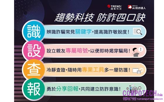 趨勢科技呼籲,防詐意識應從日常生活做起,透過「識、設、查、報」四口訣,並結合AI防詐達人的專業工具,即能降低詐騙風險,一起提升數位防詐力。