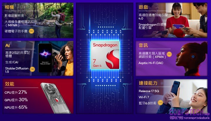 2025年5月15日--高通技術公司今日推出Snapdragon 7系列的最新產品 – Snapdragon 7 Gen 4 行動平台。此全新行動平台專為提升最受使用者喜愛的多媒體體驗而設計,並提供全面的強大效能。無論是利用先進的圖像處理功能捕捉珍貴時刻,或享受精選的Snapdragon Elite Gaming功能驅動的精彩遊戲體驗,Snapdragon 7 Gen 4平台讓使用者能全心沉浸於所愛,獲得使用者青睞。Snapdragon 7 Gen 4還具備創新的AI功能,可直接於裝置上運行生成式AI助理和最受歡迎的大型語言模型(LLM),並新增Stable Diffusion圖像生成工具。