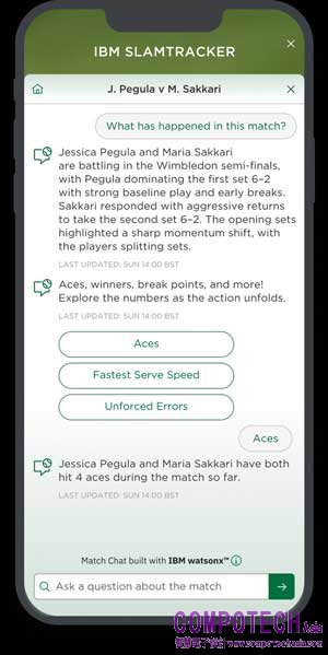球迷可通過溫網App 和官方網站體驗Match Chat功能,使用預置的提示詞(prompt)或自主提問進行互動,例如,「誰在比賽中轉換了更多的破發點?」或「誰在比賽中表現更好?」。系統將提供AI生成的實時反饋,包括比賽分析和洞察,為球迷帶來更豐富的觀賽體驗。