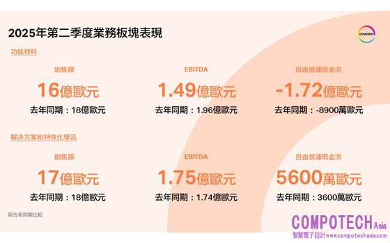 2025年第二季度,功能材料板塊銷售額下滑11.8%至16億歐元(去年同期:18億歐元)。EBITDA下降至1.49億歐元(去年同期:1.96億歐元),主要受利潤率下滑及實施STRONG轉型計畫的費用支出影響。自由營運現金流為-1.72億歐元(去年同期:-8900萬歐元)。