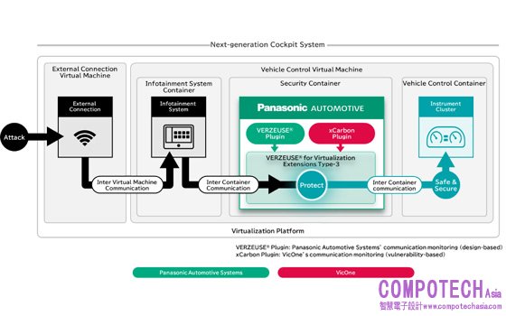 Panasonic Automotive Systems於2024年10月曾發表其開發的VERZEUSE®註二 for Virtualization Extensions Type-3攻擊偵測與防護技術,這次創新亮點是將VicOne的車用資安軟體xCarbon整合進其中,以進一步擴充其功能。