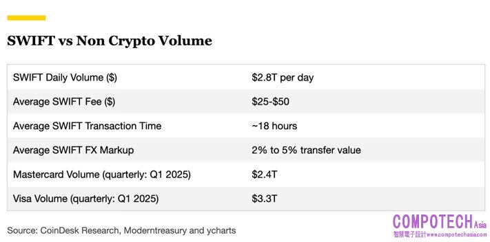 SWIFT 每天處理約 2.8 兆美元的跨境資金,但平均結算時間仍長達約 18 小時、且每筆手續費動輒 25~50 美元,這套架構基本上是為「在網際網路出現之前的時代」所設計。