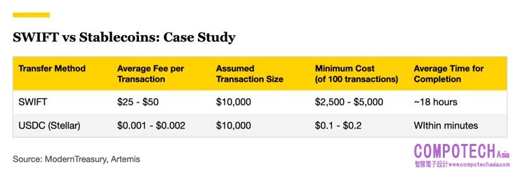 穩定幣提供了一種明確且具可行性的替代方案。結算不再需要數天,而是能在幾秒內完成;手續費也不再動輒高達 50 美元外加匯差,而是降至僅需「不到一美分」,幾乎可以忽略。