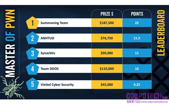 • Team DDOS的Bongeun Koo與Evangelos Daravigkas利用八項不同的漏洞(含多重注入攻擊)成功完成對QNAP Qhora-322路由器與QNAP TS-453E NAS的「SOHO Smashup」攻擊,獲得10萬美元。