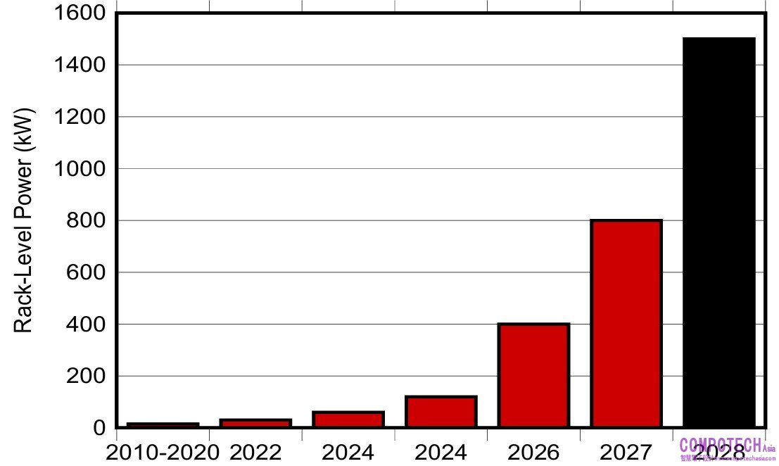 图 1 顯示了 IT 伺服器機架層級電力需求隨時間的變化。图 1 預測,到 2028 年,單個 IT 機架將需要 1.5MW 的電力,這是目前伺服器機架用電量的十倍。