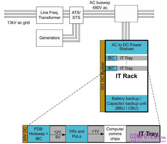 每個電源櫃通常配置六個 PSU,採用 N+1 配置以實現備援能力。透過增加電源櫃數量,即可滿足 IT 機架的總電力需求。這些電源櫃的輸出為 50VDC 匯流排,透過沿伺服器機架背面佈設的高電流母匯流排,分配至每個 IT 托盤。雖然部分第二代設備保留 UPS 功能,但其他系統會將其移除(如 图 3 所示),並以本地備用電池單元 (BBU) 取代,使 50VDC 匯流排在電力恢復或備用發電機接管前維持供電。在某些情況下,電容櫃或電容備援單元 (CBU) 有助於消除因電力中斷引起的過度電壓瞬態與電流瞬態。每個 IT 托盤內的 50V 匯流排會連接至本地中間匯流排轉換器,產生 IT 托盤中系統負載所需的 12V 電壓。