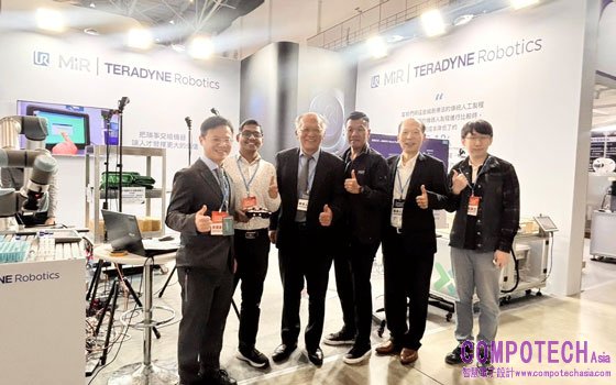 圖:UR攤位左起商務開發經理戴志謙博士、軟體工程師Jagmohan Meher、筑波科技董事長許深福、Teradyne Robotics 商務發展經理王永迪、筑波科技營運長許棟材、耐思尼行政總監王重程