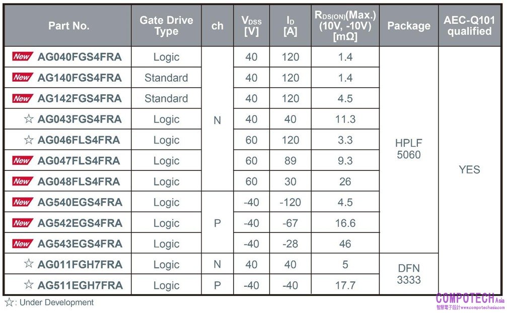 半導體製造商ROHM(總公司:日本京都市)適用於主驅逆變器控制電路、電動泵浦、LED頭燈等應用的車載低耐壓(40V/60V)MOSFET產品陣容中,新增了HPLF5060(4.9mm×6.0mm)封裝產品。