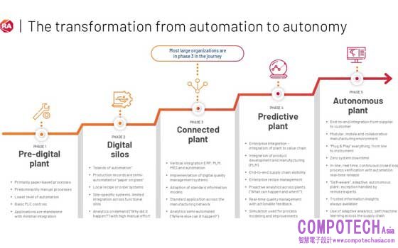 洛克威爾自動化綜覽全球製造業發展現況,提出五大自主化發展階段。企業需從仍高度依賴人工與紙本作業的前數位化工廠(Pre-digital plant),藉由數位工具與建置自動化系統,逐步走向數據整合、脫離孤島的第二階段。