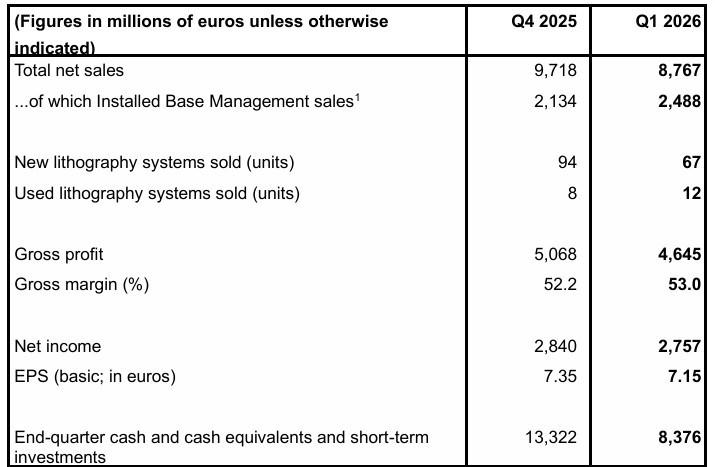ASML 執行長 Christophe Fouquet 表示:「我們第一季的總銷售淨額達為 88 億歐元,與指引一致;毛利率為 53%,落在指引高標。」