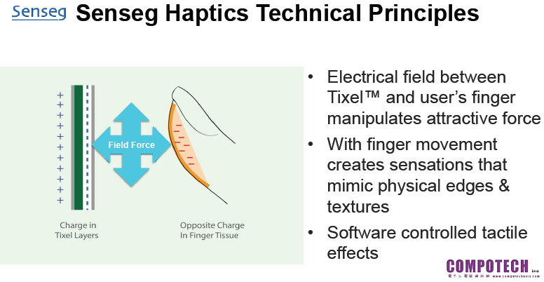 究竟Senseg技術是什麼呢? Paul Costigan表示,Senseg的目標是要將觸控(touch)螢幕轉變成觸感(feel)螢幕,在現有觸控產品上為使用者創造虛擬的觸覺感受,為觸感電子產品的用戶體驗提供可實行、可擴展方案。Senseg E-Sense®技術能讓使用者的手指肌膚感覺到觸控螢幕上的虛擬介面,分辨不同的質感。不同於目前常見的由震動器馬達引發的觸感,Senseg的觸感技術直接微震皮膚,讓使用者產生被觸碰的感受。在傳統的影音互動體驗上引入觸覺元素,這將進一步拓展電子產品的溝通性能,為互動設計提供新的可能。圖4為Senseg觸覺技術的原理圖