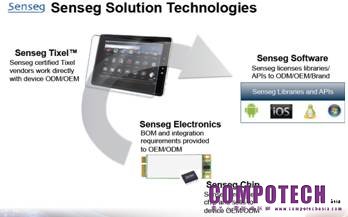 由於是用原型機展示,代表Paul Costigan的重任在於如何將Senseg技術商品化。細觀Senseg解決方案技術包括三大部份,一是Senseg Tixel光學薄膜,這部份要尋求面板廠合作並建立認證供應商體系;二是晶片與整合設計部份,這要銷售給平板電腦或手機系統製造OEM/ODM商;三是軟體部份,Senseg採授權機制將libraries與API授權給ODM/OEM/品牌商,目前適用的作業系統涵蓋Android、iOS、Linux與 Windows。(見圖5)