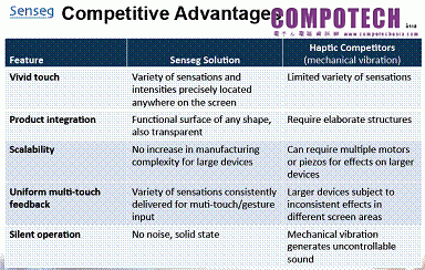 Paul Costigan對競爭優勢提出說明,他指出,Senseg解決方案的競爭對手是其他以機械震動式的觸覺(haptic)技術。從清楚觸感、產品整合度、擴展性、多指觸控回饋一致性與靜音操作等特性的比較,Senseg解決方案均略勝一籌。(見圖6)