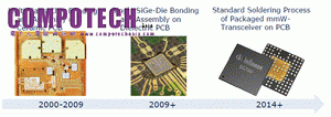 圖說: 英飛凌BGTx0 產品系列採標準塑膠封裝,並以單一晶片取代現有系統中逾十個離散元件。圖為封裝技術演進圖