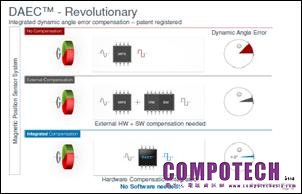 MPS(Magnetic Position Sensor)磁性位置感測器知名廠商ams奧地利微電子日前發表新一代產品系列,一樣非接觸式、以霍爾元件為基礎但更具智慧化,令其更具智慧化的技術稱為DAEC補償技術,能讓編碼器與馬達設計廠商不用在MCU或DSP外執行複雜的誤差補償演算法,就能精準測量行進中、高速旋轉車輪的角度,將動態角度誤差降至幾乎為零。