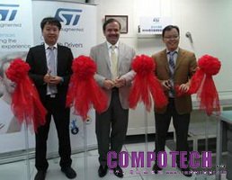 剪綵人物說明:左起, ST意法半導體大中華暨南亞區類比,MEMS及感測器事業部資深技術行銷經理郁正德、中為台灣分公司總經理尹容、右:大中華暨南亞區類比,MEMS及感測器事業部行銷總監吳衛東