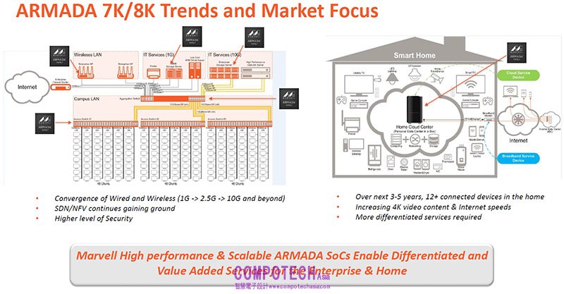 Marvell在臺北COMPUTEX推出採用Marvell開創性的MoChiTM架構、並以業界首款AR® Corte®-A72為基礎的片上系統(System-on-Chip;SoC)系列——Marvell® ARMADA® 7000及Marvell® ARMADA® 8000。Marvell的ARMADA® 7000及ARMADA® 8000產品系列具有靈活的擴展性,適用於各式各樣的IP應用、資料中心、企業、中小型企業(SMB)和小型居家辦公室(SoHo)應用。