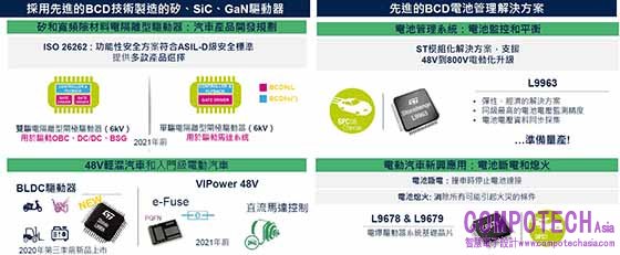 意法半導體亞太區功率離散和類比產品元件部區域行銷和應用副總裁 Francesco MUGGERI 表示,為增加性能和易用性,ST在單晶片和系統級封裝內整合GaN功率級和智慧功能。將BCD( Bipolar-CMOS-DMOS)邏輯控制器、GaN材料以及驅動器和保護功能整合在一起,為其產品在汽車電動化應用中爭搶有利位置。目前多款符合ISO 26262規範,功能性安全方案符合ASIL-D級安全標準的多款產品正處於規劃或即將上市階段,如:用於驅動OBC、DC/DC、BSG的雙驅電隔離型閘極驅動器(6kV),和用於驅動馬達系統的單驅電隔離型閘極驅動器(6kV)預計在2021年前上市。
