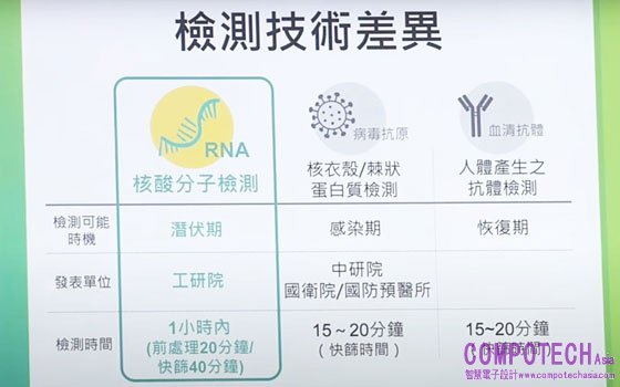 彭裕明期許台灣地區能發揮高 CP 值優勢,共同推展快、狠、準的檢疫方案,並透露當此關鍵零組件供不應求之際,3D 列印將能及時救援。台灣地區醫事檢驗學會監事暨中山醫學大學附設醫事檢驗科組長謝明昌講解,肺炎檢測有三大重點:病毒本身 RNA 檢測、病毒抗原快篩,以及病患免疫所引發的抗體反應。其中,第二種快篩的優點是可大量採撿,但缺點是準確度只有五成上下;第三種屬於後端檢測,屬於事後諸葛、卻是開發疫苗不可或缺的環節。論及第一線防疫,針對病毒本身 RNA 仍是最有效的手段;若能成功擴大檢測量能,最多一次可完成 96 個檢體。