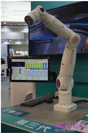 六軸機器手臂,第一代驅控整合關節模組為L-type構型,採用自主開發馬達、減速機、驅動器、控制器等關鍵零組件,可讓機器手臂做到穿針引線動作,精度符合工業應用作業要求
