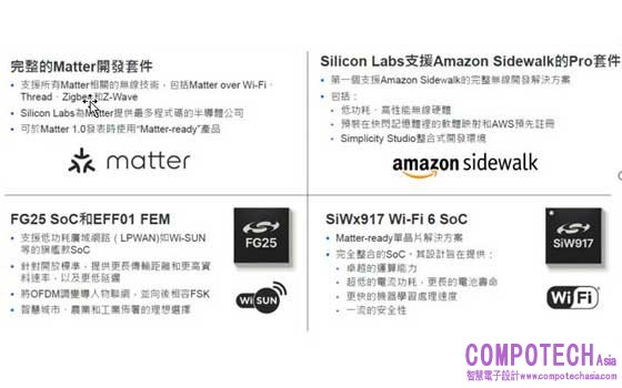 因是在物聯網成熟之際推出第二代平臺無線SoC系列,市場正在尋找整合了硬體、軟體、安全性、工具和相關支援的物聯網平臺,而非單點解決方案。如今,Silicon Labs在第二代平臺成功的基礎上,擴大了其產品範圍,推出一系列四類新產品,包括了完整的Matter開發套件、支援Amazon Sidewalk的Pro套件、FG25 SoC和EFF01 FEM,以及SiWx917的Wi-Fi 6 SoC晶片等。