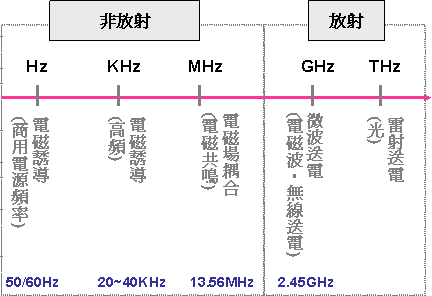 若是從頻率軸來觀看,電磁誘導可以有商用電源50/60Hz以及使用較高頻率20~40KHz的方式。而電磁偶合是以10MHz附近來動作;微波送電是在GHz頻帶;而雷射送電則是在THz的頻帶。