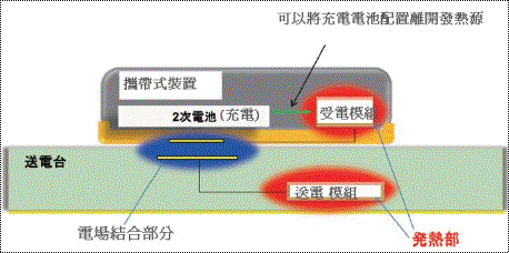 電場的結合部分是交流電壓帶電平面狀導體,通過電流極為微小,導體本身不會過熱。發熱來源的電路部份與電場的結合部分分離;對於熱能比較軟弱的裝置(好比說電池)之近旁形成了電場的結合部分。