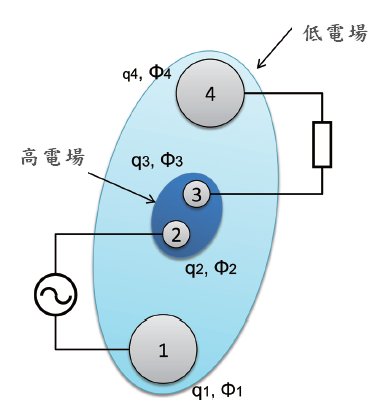 電極1、電極2以及振盪器構成了送電側部份的Dipole。電極3、電極4以及負荷構成了受電側部份的Dipole。為了構成Dipole的非對稱性,主動電極(電極2、電極3)的周圍集中電場成為高電場,被動電極部分(電極1、電極4)周圍乃是低電場。