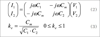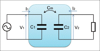 Dipole電氣上呈現中性。因此,存在著q1+ q2 = 0、q3 + q4 = 0的關係。若是著目於電力傳送的場合,可以導入等效並列容量(C1,C2)、等效相互容量(Cm)以及結合係數(Ke),來描述數學式1的兩端子等效電路;如下圖所示: