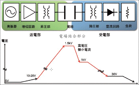 在送電側,將交流信號作放大‧升壓,在送電電極利用了電壓來激振。送電電極以及受電電極,由於電場的結合,利用驅動頻率反覆地帶電‧誘導。電場結合部分阻抗高,是以高電壓、微小電流來動作