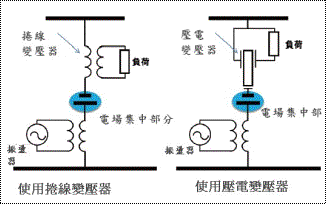為了簡化起見,利用正弦波產生器以及放大(增幅)電路來描述,實際上它的構成是直流電源與開關(switching)電路。升壓部分‧降壓部分,除了可以使用卷線變壓器之外,若是要達成低輪廓化,也可以選用”壓電變壓器”;也可以使得共振的動作更具有高效率化。追加升壓部分‧降壓部分的模式概念圖,如底下所示:
