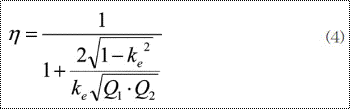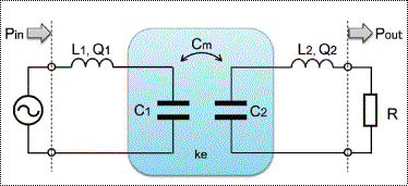 在送電部份、受電部份追加了誘導性元件。為了簡化起見,各個線圈以電感(L1,L2)以及Q factor(Q1,Q2)來表示。Pin乃是輸入電力(功率),負載的消耗電力為Pout;那麼電力傳送效率(η)就可以用數學式子來定義: