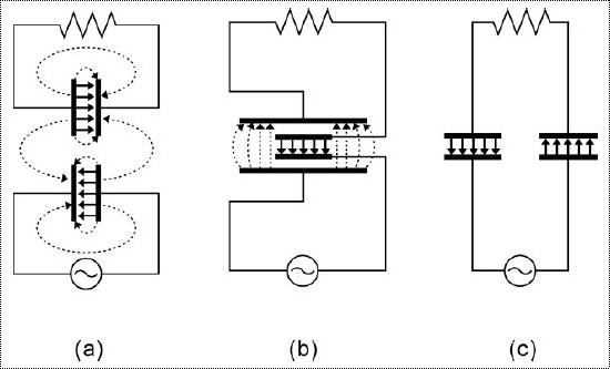 對於電場結合的電極構成,有多種方式,如下圖: