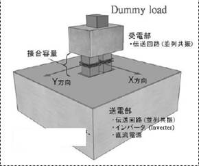 根據以上所說採用的共振電路與電極構造,所製作裝置的外觀圖如下:下側乃是送電部份,上側是受電部份,受電部安裝了一個虛擬負荷(Dummy load)。送電部與受電部之間,並置了兩個接合容量。這個裝置為了進行實驗上的緣故,體積上稍微大了一些,而且,實際上裝置的受電部份也需要支撐的機構。