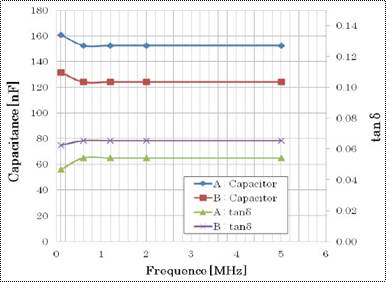 下圖是所製作兩個接合容量A,B(導電性軟電極與強介電體對向之構成)的容量以及tanδ的測量結果(接觸的壓力大約是40g/cm2)。