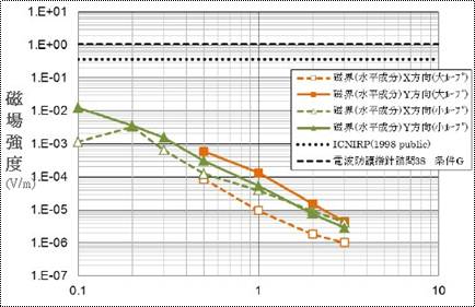 圖: 2.0MHz、50W電力傳送的放射磁場強度(從電極端之距離)。