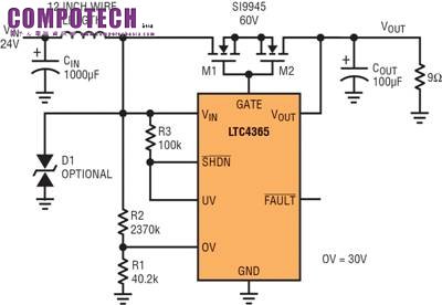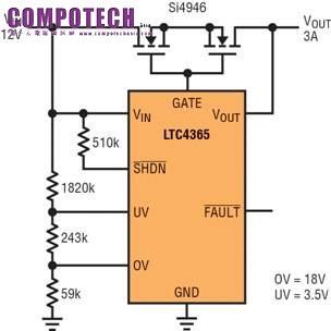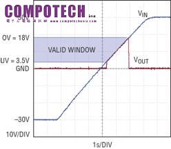 圖 1 顯示了一個完整的應用。電阻分壓器設定過壓 (OV) 和欠壓 (UV) 跳變點,以連接或斷開負載與 VIN 的連接。如果輸入電源電壓變化到這個電壓視窗之外,那麼 LTC4365 就快速斷開負載與電源的連接。