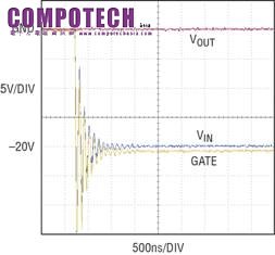 圖 3 顯示了當 VIN 被帶電接入 -20V 電壓時會發生的情況。VIN、VOUT 和 GATE 在連接建立瞬間從地電位開始變化。由於 VIN 和 GATE 連接的寄生電感,VIN 電壓和 GATE 接腳在低於 -20V 的電壓上明顯地振盪。外部 MOSFET 必須具有能承受這種過沖而不被損壞的擊穿電壓。