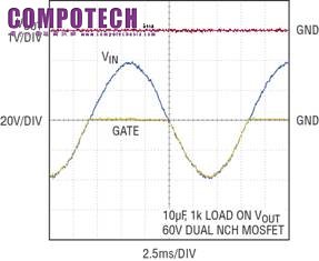圖 4 顯示,LTC4365 隔離 40V 至 -40V 的 AC 線電壓。在負電壓部分,GATE 接腳跟隨 VIN,但當 VIN 變為正電壓時,GATE 接腳仍然保持在地電位。注意,VOUT 一直不受影響。
