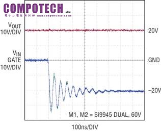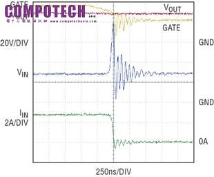 在負電壓瞬態時,GATE 接腳追隨 VIN 的密切程度決定了 LTC4365 反向連接保護電路的速度。在圖中所用比例情況下,兩種波形幾乎無法區分。注意,無需額外的外部電路來提供反向連接保護。