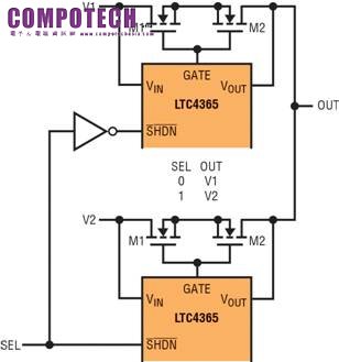 該元件關機時,VIN 和 VOUT 接腳可以由兩個不同的電源以不同的電壓驅動。LTC4365 自動驅動 GATE 接腳至低於兩個電源之中較低的電壓,從而防止電流從任一方向流過外部 MOSFET。圖 7 所示應用使用兩個 LTC4365,以在兩個電源之間做出選擇。應該小心地確保在任意給定時間內兩個 LTC4365 中只有一個被啟動。