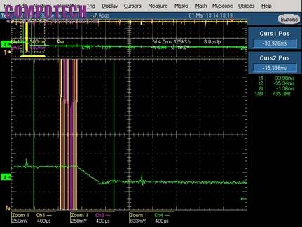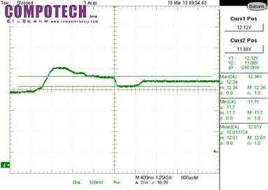 12V 輸出在微調可變電阻的過程中需要不斷修正收歛以達到1%以內電壓精準度,但是輸出電壓也短暫處於不穩定的狀態如圖1,既耗時又耗工。