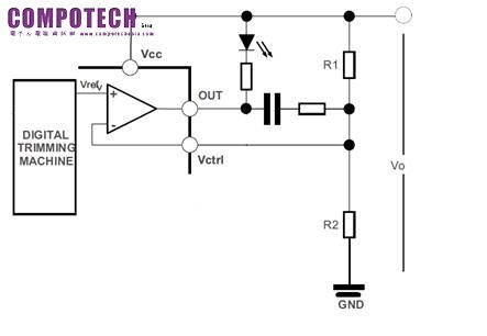 在想達到1%以內電壓精準度應用下參考準位與電阻精準度皆會嚴重影響輸出電壓精準度。一般來講在分壓電阻中加入一可變電阻(Variable Resistor)調整輸出電壓,因此設計時調整範圍不可太窄但又須兼顧精確性,然而多轉數微調可變電阻需要機械調校動作導致生產速度慢再加上溫度變化下的機構件及耐振性(vibration) 導致重複不斷測試穩定度也為生產良率提供了一大難題。