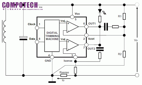 在測試的產品的生產過程中,嵌入的數位調整允許使用者可通過軟體調整和永久儲存存兩個獨立的Vrefv和內部參考Vrefi來補償外部元件的誤差離散值。由於其離散值的移動設備IC 提供了一個非揮發性記憶體(NVM)的內含OTP(雙組OTP一次性可程式記憶體)及揮發性內存記憶體,此記憶體是用來調節Vrefv 及Vrefi內部參考的值:一旦已發現的最佳值使用者可以永久地將它們儲存在第一個OTP內存。允許使用者進行第二次微調過程存在第二OTP,有可能使在某些不可預期的情況下,如客戶規格改變下需要搜索一個新的最佳Vrefv 與Vref值就可以將這些數值永久儲存存第二OTP。在IC 上電時的值Vrefv與 Vrefi是取決於OTP狀態: -如果IC記憶體從來沒有被燒錄過,(即沒有任何值儲存在OTP記憶體)VrefV和Vrefi被初始化為預設值,如果IC被燒錄過一次(即值儲存在第一OTP中)VrefV 和Vrefi的值會被選擇在調整過程中由使用者儲存在第一OTP記憶體的值。同樣的如果IC被燒錄過二次(即值儲存在第二OTP)VrefV Vrefi的值會被選擇在第二調整過程中由使用者 儲存在第二個OTP記憶體的值。此外該IC 提供了只需要兩個腳pin 的I2C slave通信界面:DATA 和 CLOCK. I2C界面允許使用者以簡單的方式透過I2C 匯流排,為確保通信的可靠與完整性外加了奇偶校驗控制。