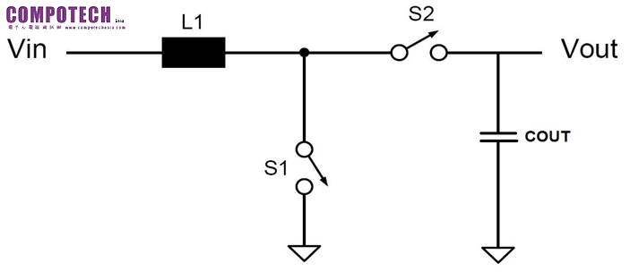 圖1為升壓轉換電路的標準運作模式,能量從Vin經過電感L1以及開關S1和S2到Vout。