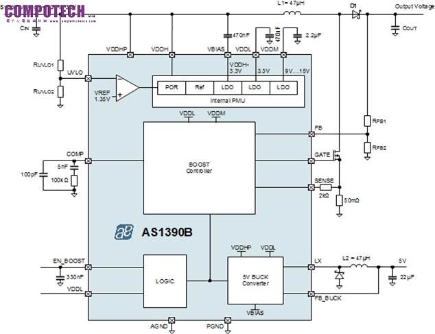 目前業界有些廠商所推出的升壓控制器(見圖2)就能做到這樣的技術,它是一個大功率的升壓控制器,可以支援10V到30V的輸入電壓以及30V到90V的輸出電壓。(這顆晶片還包括一個5V的降壓轉換器)。12V輸入電壓60V輸出電壓條件下的最大負載電流為3A。